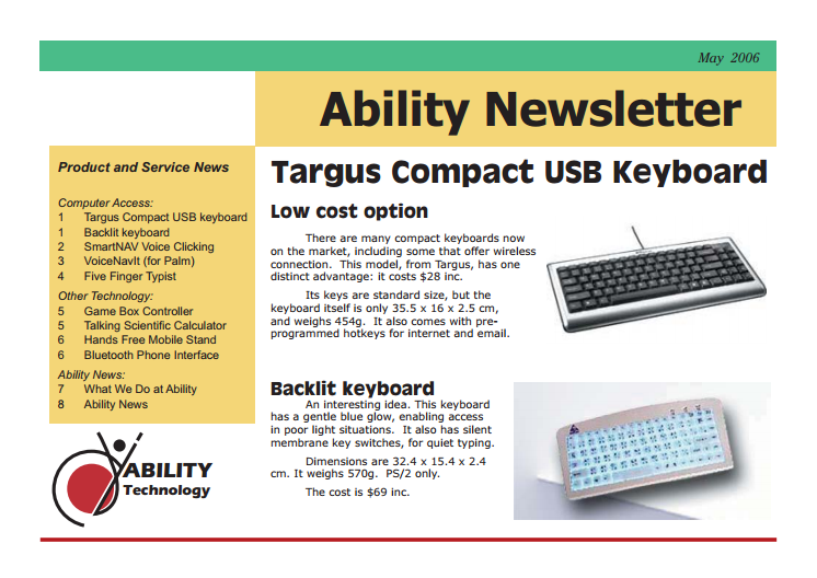 Ability Technology assists people with a disability to be more productive through computer and related technology. Our services include giving advice, assessing needs for special hardware and software, supplying and customising technology and providing training and support. We are experienced in integrating specialised technology into company or school networks.
